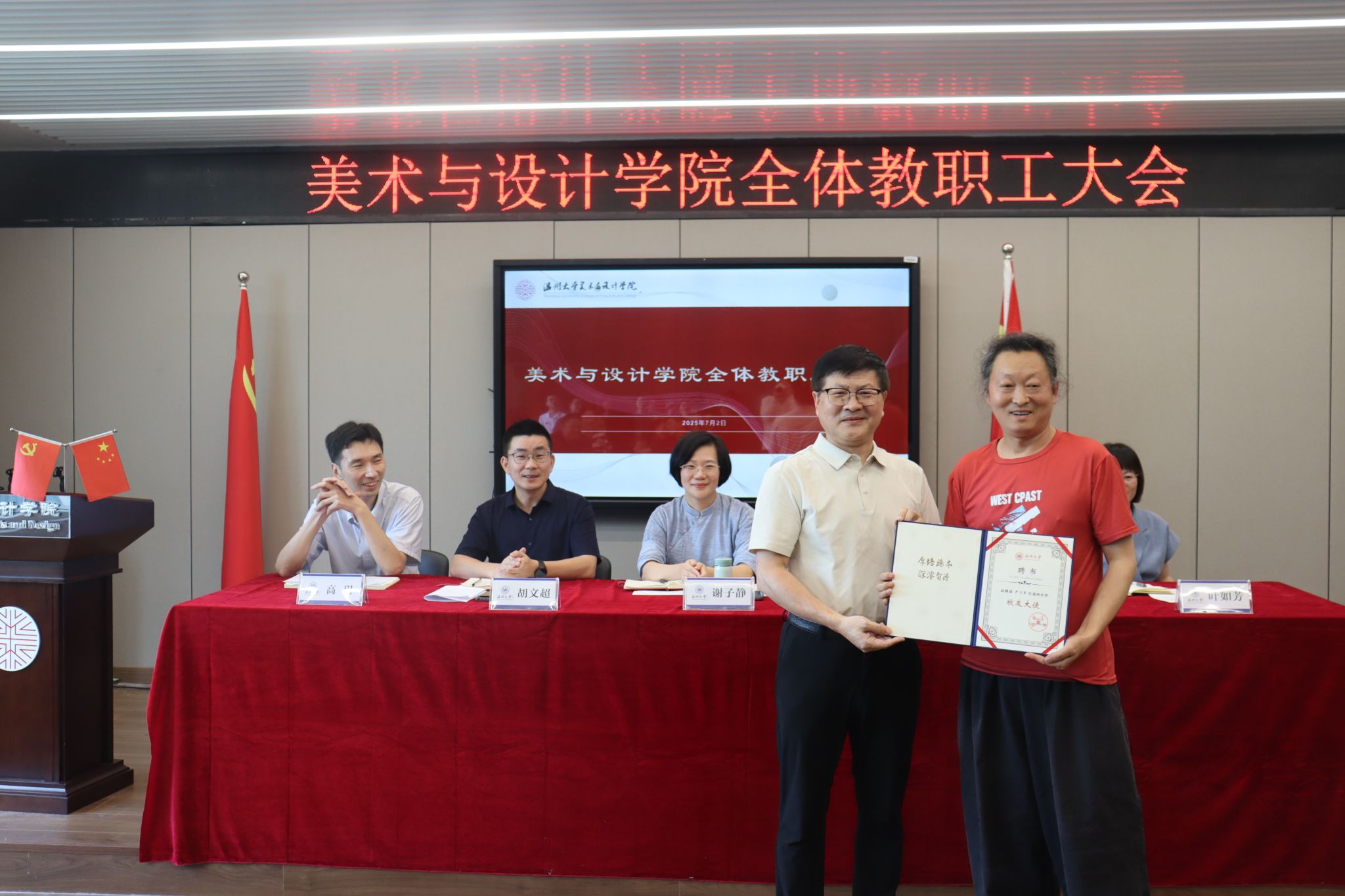 党委书记刘青松传达学校保密工作有关精神,就党建相关工作进行总结,针对暑期和下学期进行部署,并为尹乃军老师颁发温州大学校友大使聘书。随后全院教职工观看了习近平对精神文明建设工作作出重要指示、习近平致信祝贺复旦大学建校120周年相关视频内容。