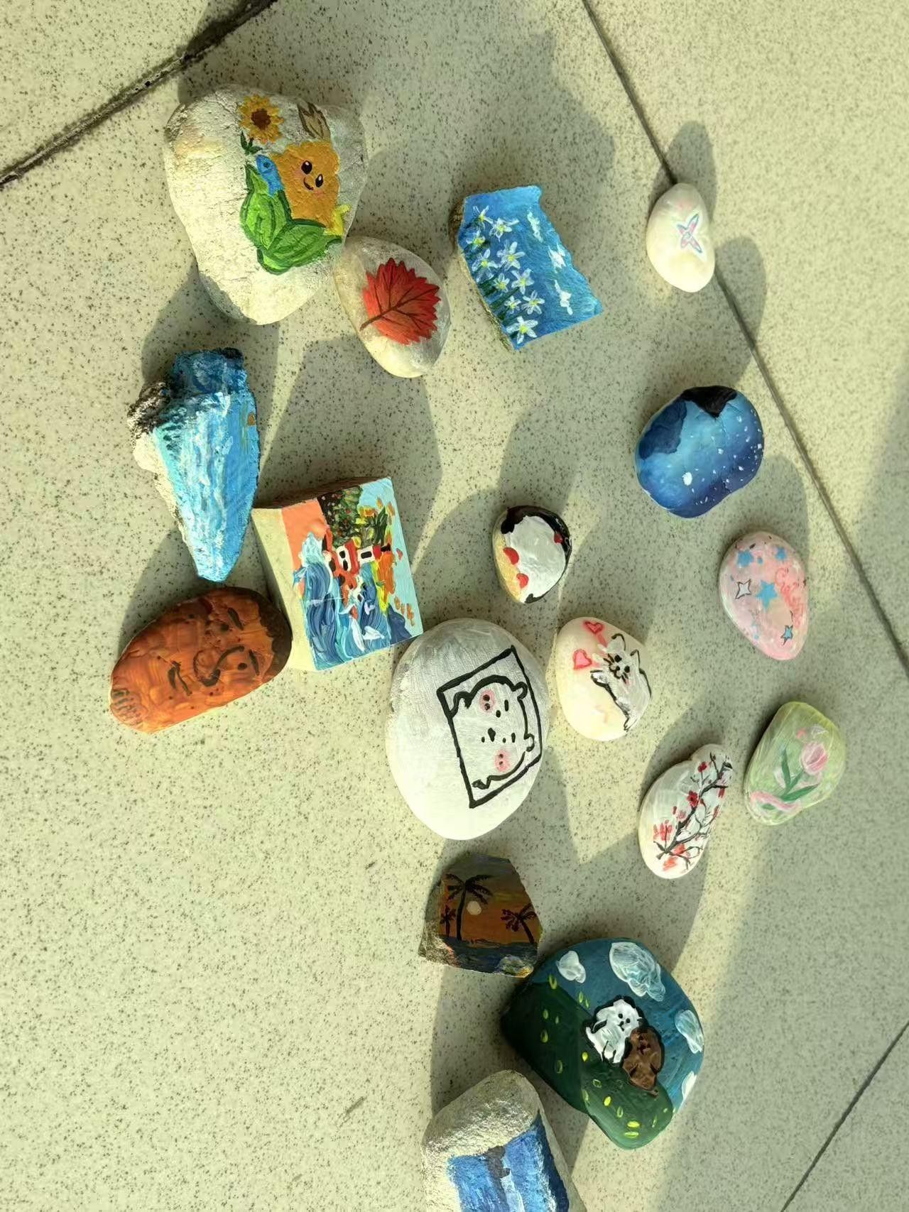 创作过程中,同学们或专注描绘,或轻声交流想法,现场洋溢着轻松愉悦的氛围。活动尾声,大家手持自己完成的石绘作品合影留念,彼此分享创作心得,在收获个人“小确幸”的同时,也真切感受到艺术创作带来的治愈与温暖。