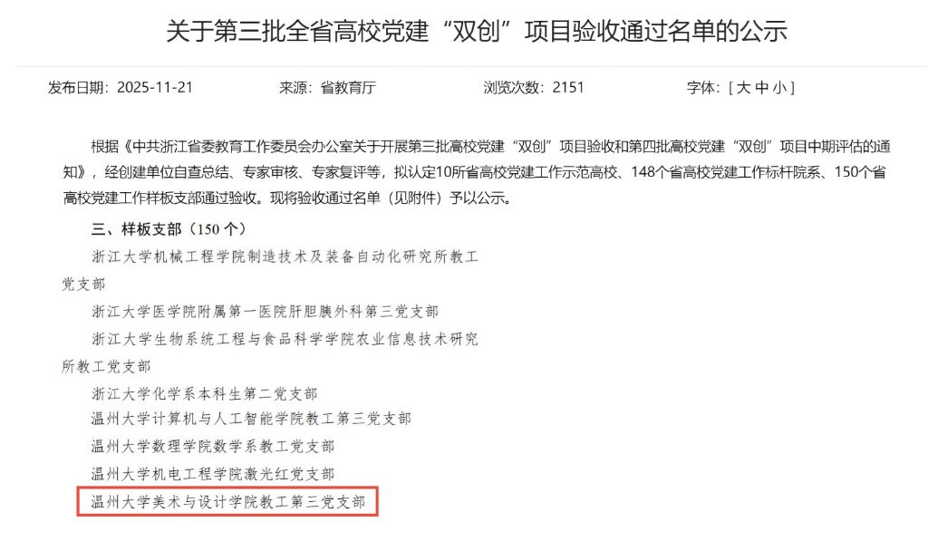 近日,中共浙江省委教育工作委员会发布《关于第三批全省高校党建“双创”项目验收通过名单的公示》,公布了第三批全省高校党建工作示范高校、标杆院系、样板支部验收通过名单。黄色网 教工第三党支部2023年8月确定为第三批全省高校党建“双创”培育创建对象,经过2年创建,顺利通过验收。