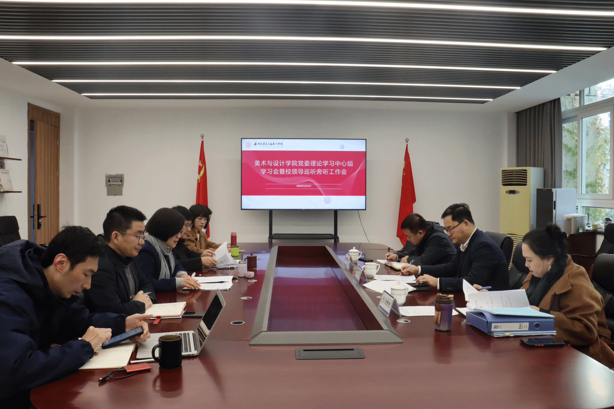2025年12月30日上午,黄色网 党委理论学习中心组在学院2B216会议室召开专题学习会,深入学习贯彻二十届四中全会精神及新时代思想政治工作相关要求。校领导王军副校长率巡听旁听组全程指导,学院党委理论学习中心组成员出席会议,刘青松主持会议。会上,谢子静院长领学习近平总书记考察广东重要讲话精神及温州市委十三届九次全体(扩大)会议精神。她结合学院实际,从深化系统性改革激发内生动力、以高水平开放拓展发展空间、以高质量育人坚守初心使命三个维度,阐述了学院对接国家战略与地方发展的实践路径,强调要推动艺术与数字科技、人工智能深度融合,助力温州文化强市与生态强市建设。随后,刘青松领学《中国共产党思想政治工作条例》等内容,系统解读了条例出台的时代背景、核心定位与四大核心问题框架,明确了思想政治工作“是什么、谁来做、做什么、怎么做”的关键要义,指出条例为学院开展思想政治工作提供了根本遵循,要切实将其融入教育教学全过程。交流发言环节,中心组成员围绕学习主题,结合分管工作谈认识、讲体会。大家一致认为,要将二十届四中全会精神转化为推动学院发展的具体行动,聚焦学科专业优化、人才培养质量提升、产学研融合等重点工作;同时要立足艺术学科特色,创新思想政治工作方法,强化课程思政建设,培育德艺双馨的艺术人才。王军副校长对本次学习会给予充分肯定,认为会议准备充分、研讨深入、联系实际紧密。他结合学院发展现状提出要求,强调要精准谋划“十五五”发展规划,聚焦核心专业发展,集中资源打造特色亮点;要健全制度体系,以科学评价机制激发师生活力;要立足温州产业特色,推动美育与设计高质量协同发展,提升服务地方发展的能力与贡献度。